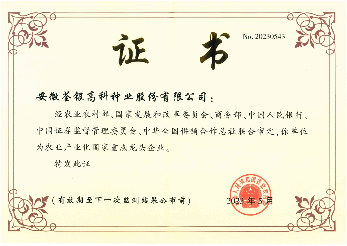 安徽荃銀高科種業(yè)股份有限公司是一家“以種業(yè)為核心、農(nóng)業(yè)服務(wù)為延伸、探索和創(chuàng)新農(nóng)業(yè)多元化發(fā)展”的現(xiàn)代高科技種業(yè)上市公司,證券代碼:300087。公司注冊(cè)資金9.47億元,系“中國(guó)種業(yè)領(lǐng)軍企業(yè)、農(nóng)業(yè)產(chǎn)業(yè)化國(guó)家重點(diǎn)龍頭企業(yè)、國(guó)家高新技術(shù)企業(yè)、農(nóng)業(yè)部首批農(nóng)作物種子育繁推一體化企業(yè)、中國(guó)種業(yè)信用明星企業(yè)"。在國(guó)內(nèi)控股子公司20多家,在國(guó)外設(shè)立分支機(jī)構(gòu)4家,良種銷(xiāo)售至全國(guó)20多個(gè)省(市、區(qū)),出口覆蓋20多個(gè)國(guó)家與地區(qū),種業(yè)綜合實(shí)力、雜交水稻研發(fā)、推廣及海外業(yè)務(wù)規(guī)模均居全國(guó)種子企業(yè)前2位。